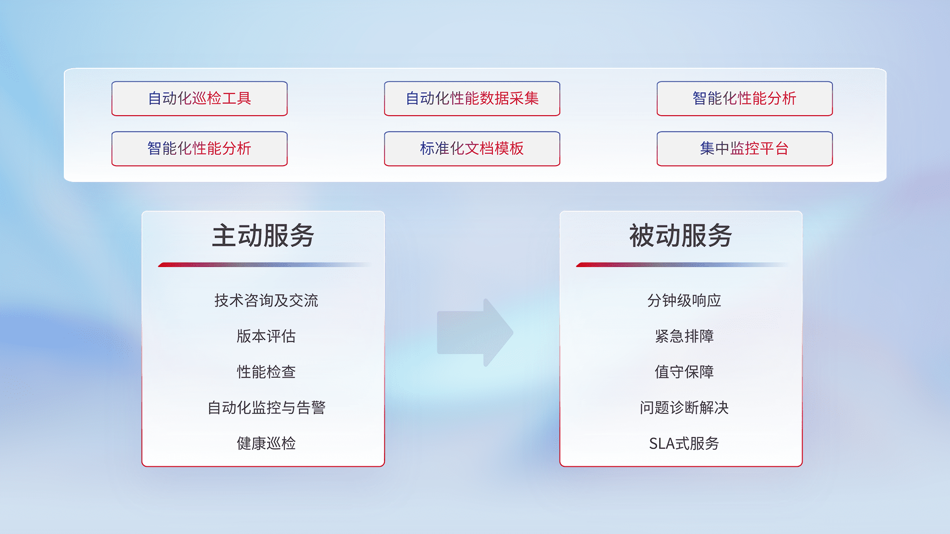 智能化工具和标准化文档,,保障服务质量,,,提供主动服务(包含技术咨询、、、版本评估、、、、性能检查、、、自动化监控与告警、、健康巡检)和被动服务包含(分钟级响应、、、、紧急排障、、、、值守保障、、、、问题诊断解决、、、、SLA服务)。。。